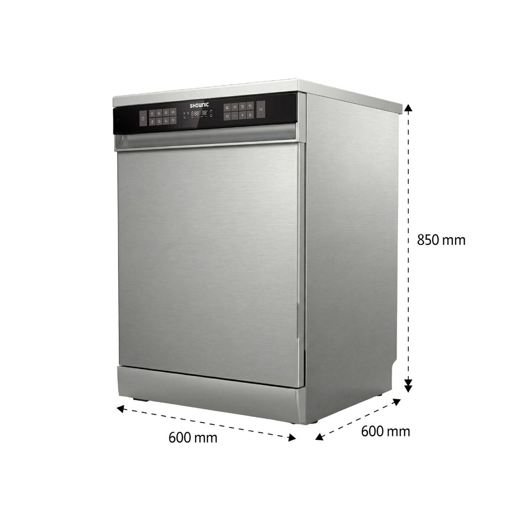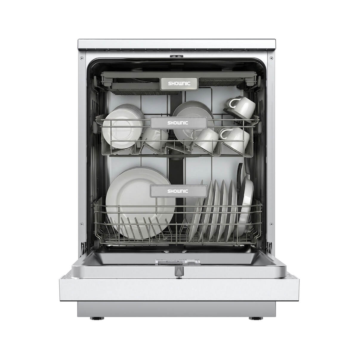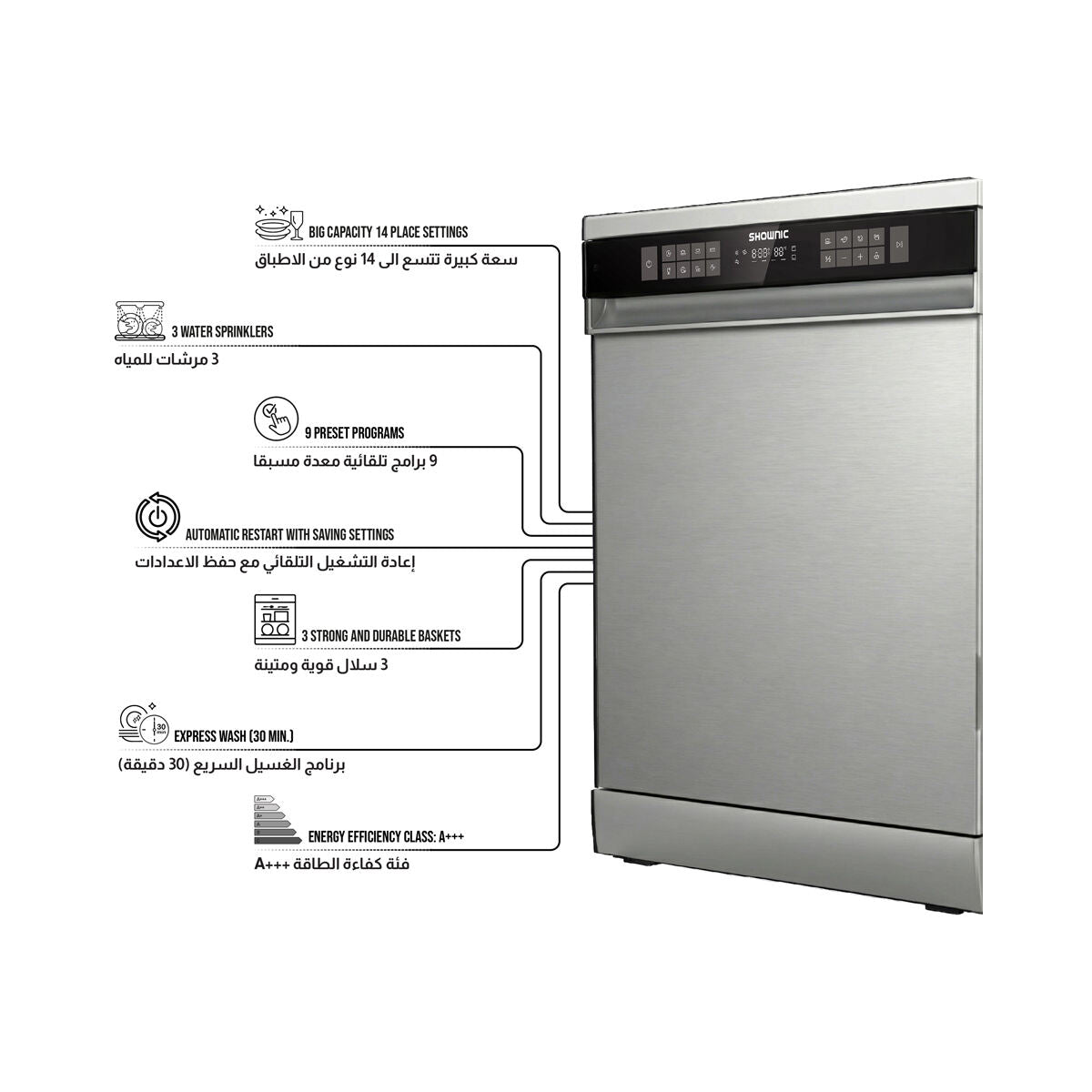غسالة صحون شونك بسعة 14 موضع غسيل / 3 سلال - 2 لاطباق وقدور + سلة لادوات المطبخ / 3 مرشات للماء / اعادة التشغيل التلقائي / أقتصادية بأتهلاك الطاقة / تعمل بهدوء وبضوضاء منخفضة / 9 برامج غسيل جاهزة ( تعقيم 70 درجة/ أقتصادي / زجاجيات / 90 دقيقة / 60 دقيقة/ سريع/ نقع / تنظيف ذاتي ) / تعقيم وحماية من البكتيريا / برنامج الغسل السريع في 30 دقيقة / خاصية التشغيل بنصف الحمولة لتوفير الطاقة والمياه / خاصية تأخير بدء التشغيل 3-6-9 ساعات / خاصية التجفيف الاضافي / تصميم أنيق مع سهولة الاستخدام والتشغيل / قفل حماية للاطفال / اللون ستانلس ستيل