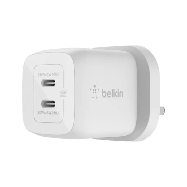 The Belkin 45W Dual USB-C GaN Wall Charger with PPS (White) is a compact, high-performance wall charger that delivers fast, safe charging for two devices simultaneously. It uses GaN technology for efficiency and PPS (Programmable Power Supply) for optimized charging across smartphones, tablets, and laptops