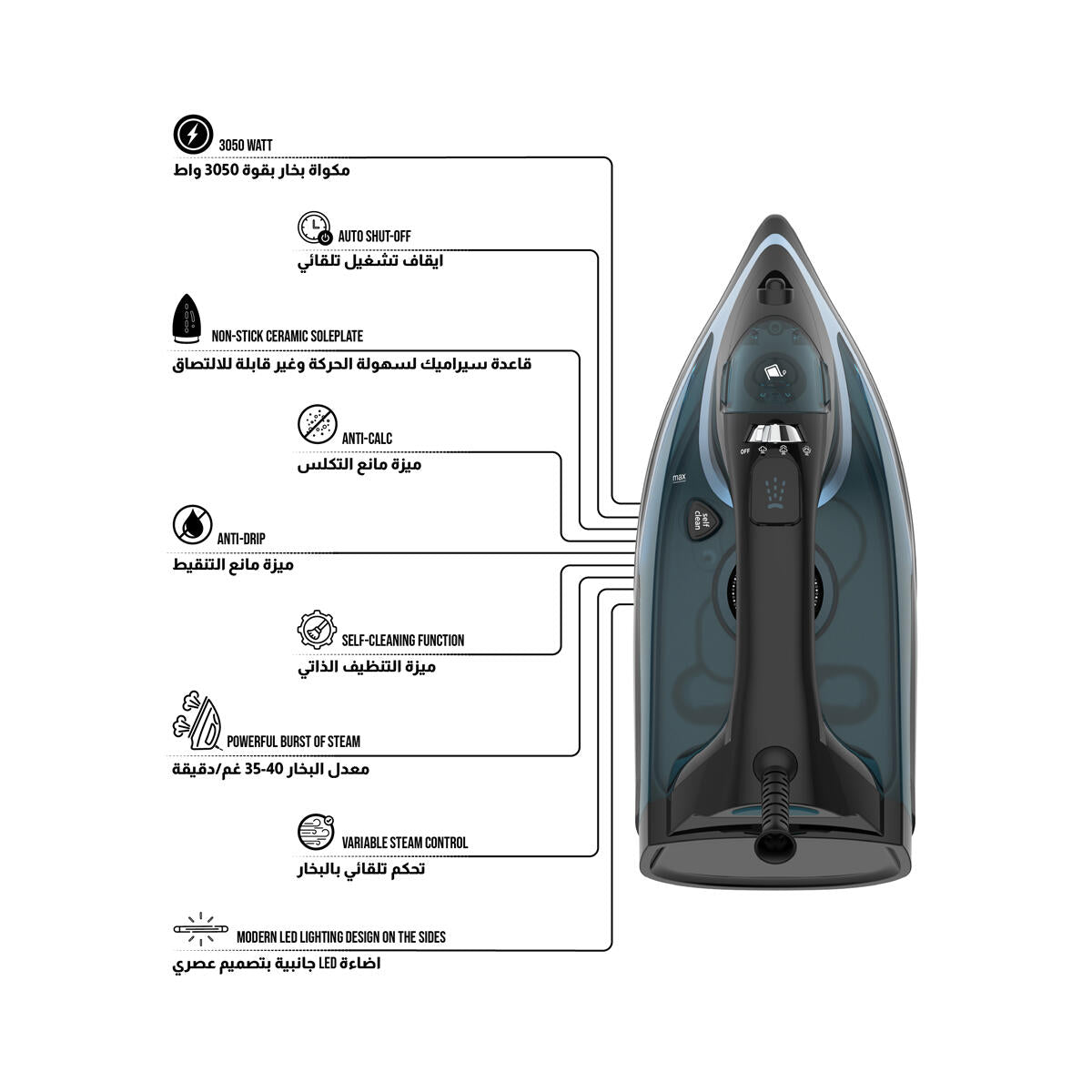 Steam button in the palm of the hand for easy steam control