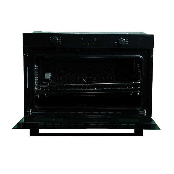 Powered by strong upper (2600W) and lower (3500W) gas heating, this full gas cooking system with fan assistance ensures faster heat circulation and even cooking results. The sleek black finish with stainless steel handle adds a modern touch to any kitchen. Featuring 5 cooking functions, dual halogen interior lighting, and a triple-layer glass door for enhanced insulation and safety, this oven delivers both performance and efficiency. The advanced 3*CATA catalytic cleaning system with Aqua cleaning support helps reduce grease buildup for easier maintenance. Complete with telescopic rails and a rotary grill, it provides maximum flexibility for roasting, grilling, and baking.
