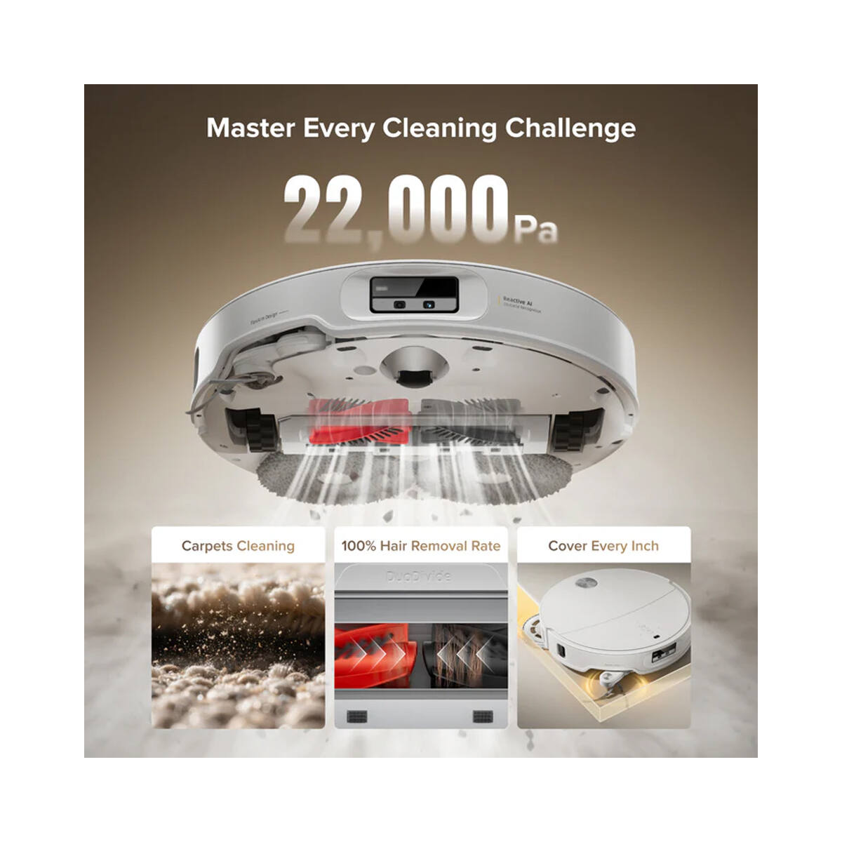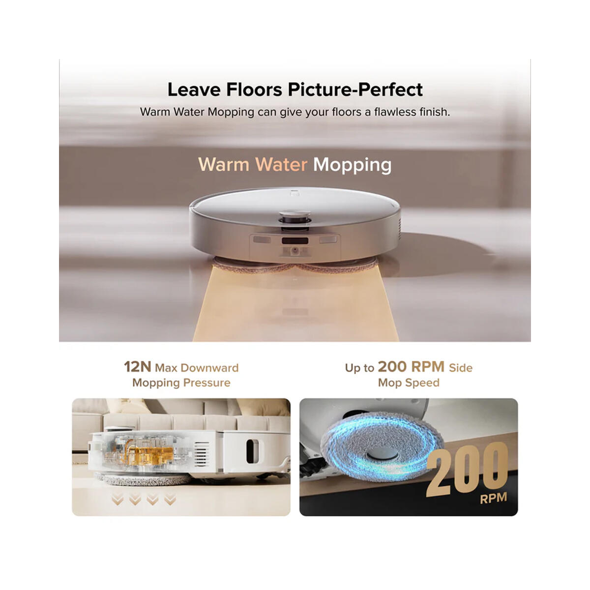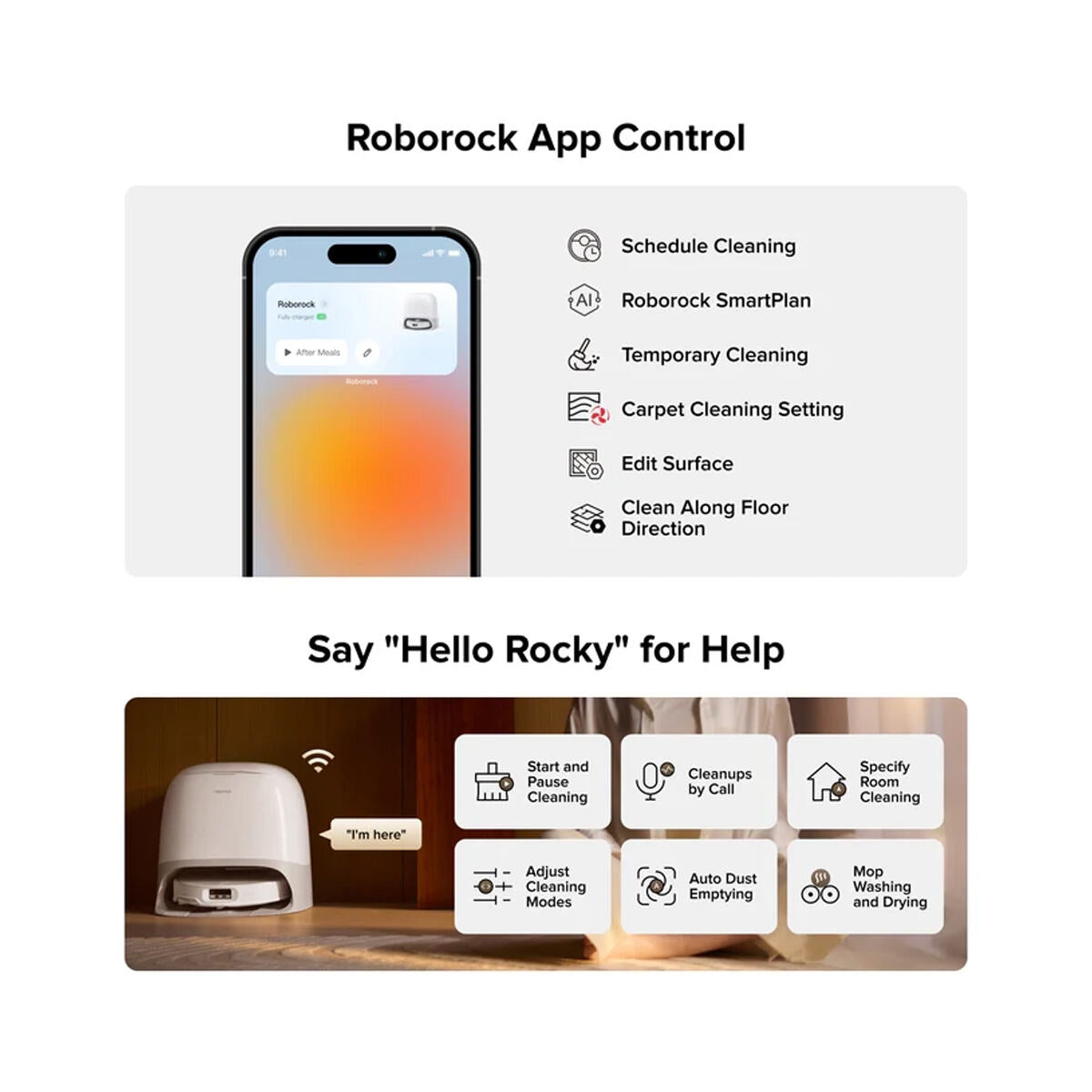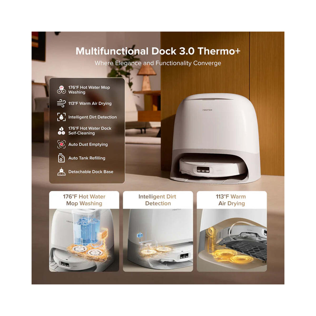 Delivering up to 22,000Pa HyperForce suction, it ensures deep carpet cleaning and efficient long-hair removal thanks to its advanced dual anti-tangle brush system. The upgraded Multifunctional Dock 3.0 Thermo+ washes mop cloths with hot water at 80°C (176°F) and dries them with hot air to reduce bacteria and odors. It automatically refills water, switches intelligently between vacuuming and mopping, and returns to the dock when needed. With 3D obstacle avoidance, built-in camera monitoring, spot cleaning, auto re-clean, and full control via the Roborock app, it delivers a truly smart home cleaning experience. Compatible with Alexa, Google Home, and Siri, and powered by a 6400 mAh battery, it provides up to 240 minutes of continuous operation.