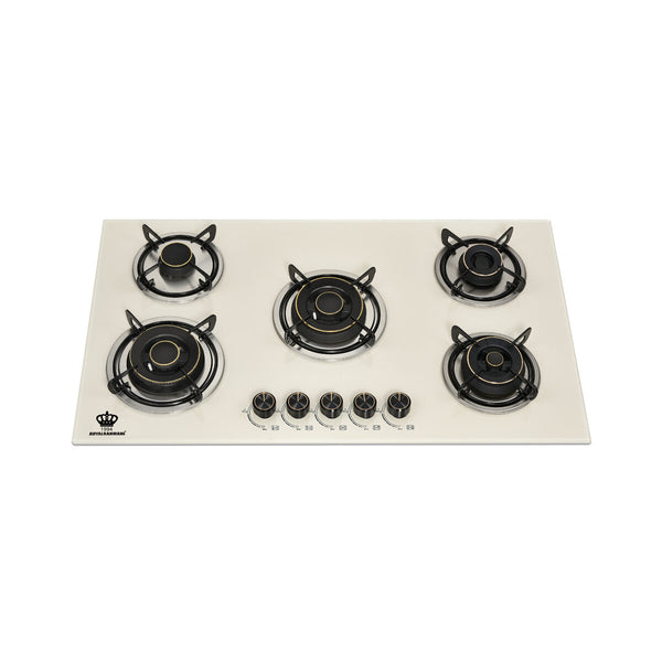 Cook with precision and style using the ROYAL AL RAHMANI RR61CK Built-In Gas Cooker, featuring 5 burners of various sizes for versatile cooking and a stainless steel design for durability and effortless cleaning. The cast iron pan supports ensure stability and safety for all your cooking needs.