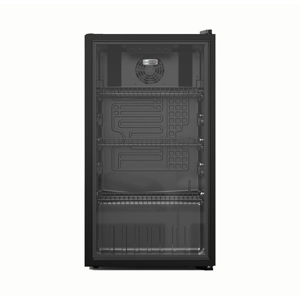 Keep your beverages and food perfectly chilled with the SH-KVC90C Beverage Cooler, offering a 90 L net capacity and a temperature range of 0–10 °C. Designed for both style and functionality, it features a sleek black interior, a recessed handle for a modern look, and three durable wire shelves for organized storage. The interior LED light ensures clear visibility, while its 2 feet + 2 wheel design makes placement and movement effortless.