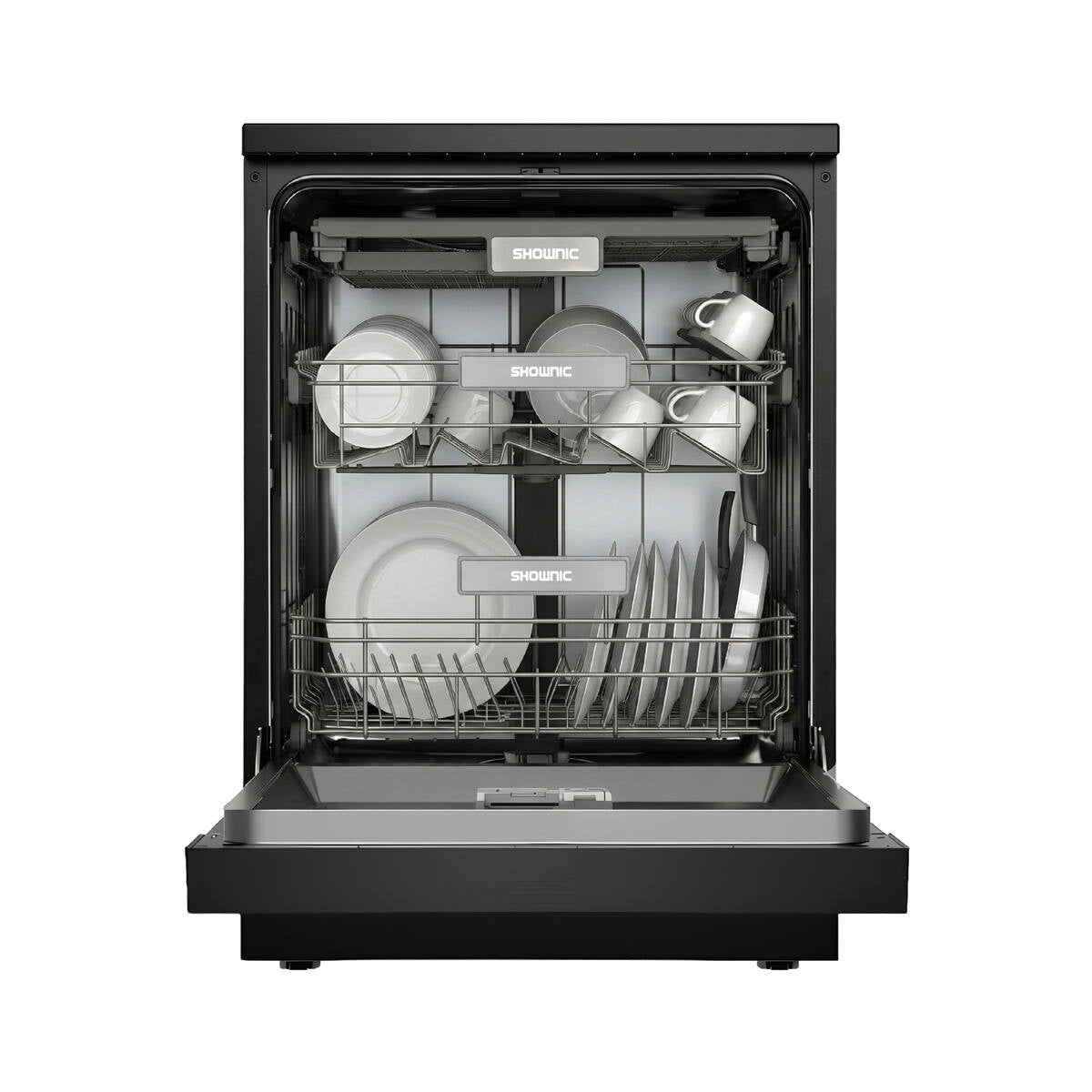 غسالة صحون شونك بسعة 14 موضع غسيل / 3 سلال - 2 لاطباق وقدور + سلة لادوات المطبخ / 3 مرشات للماء / اعادة التشغيل التلقائي / أقتصادية بأتهلاك الطاقة / تعمل بهدوء وبضوضاء منخفضة / 9 برامج غسيل جاهزة ( تعقيم 70 درجة/ أقتصادي / زجاجيات / 90 دقيقة / 60 دقيقة/ سريع/ نقع / تنظيف ذاتي ) / تعقيم وحماية من البكتيريا / برنامج الغسل السريع في 30 دقيقة / خاصية التشغيل بنصف الحمولة لتوفير الطاقة والمياه / خاصية تأخير بدء التشغيل 3-6-9 ساعات / خاصية التجفيف الاضافي / تصميم أنيق مع سهولة الاستخدام والتشغيل / قفل حماية للاطفال / اللون ستيل أسود