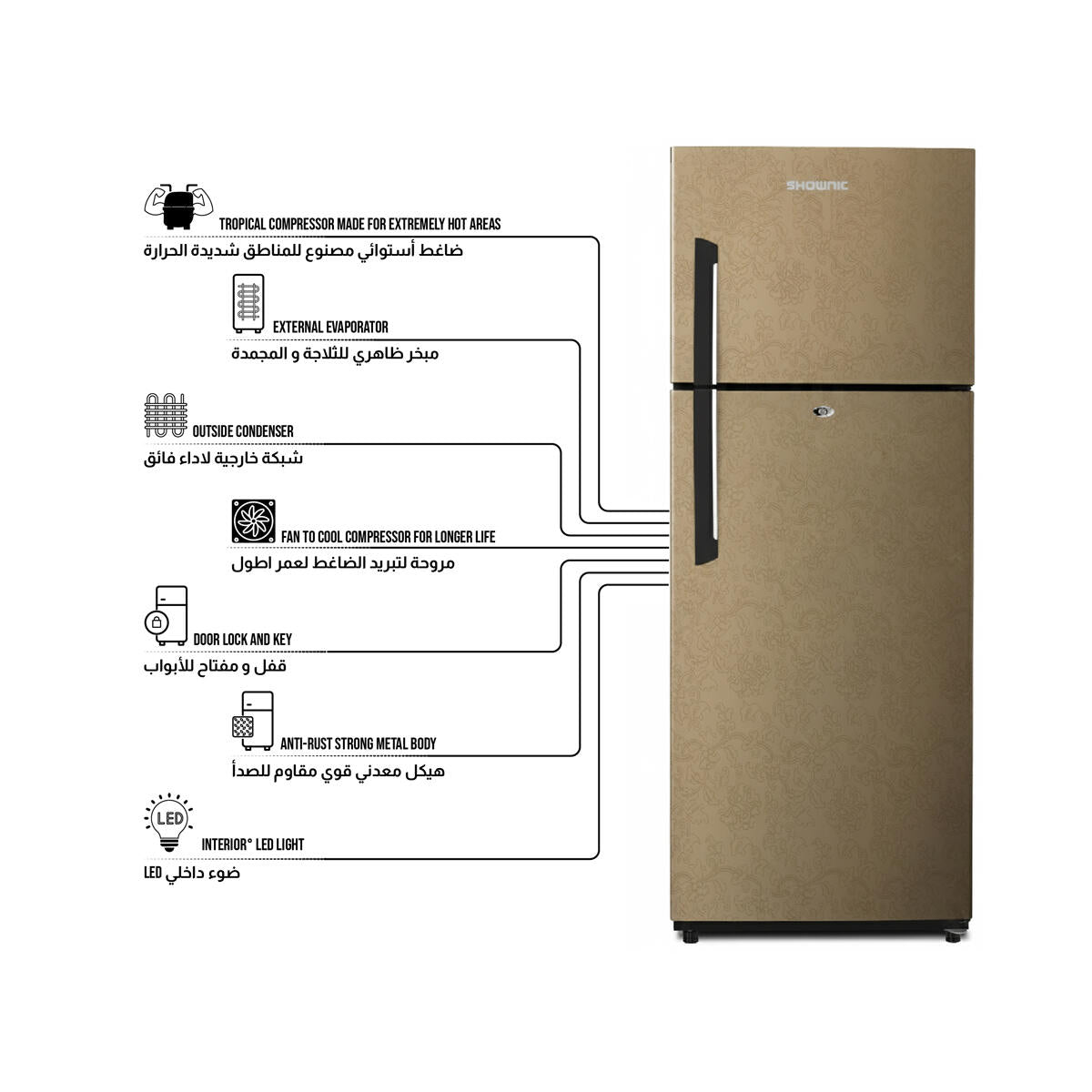 مصممة لأداء موثوق، تتميز ثلاجة SHOWNIC RL-540ZG بنظام تبريد مباشر قوي يحافظ على الأطعمة طازجة ومحفوظة بشكل متساوٍ. ومزودة بضاغط استوائي عالي الكفاءة، تم تصنيعها خصيصًا للعمل بسلاسة حتى في المناخات شديدة الحرارة.