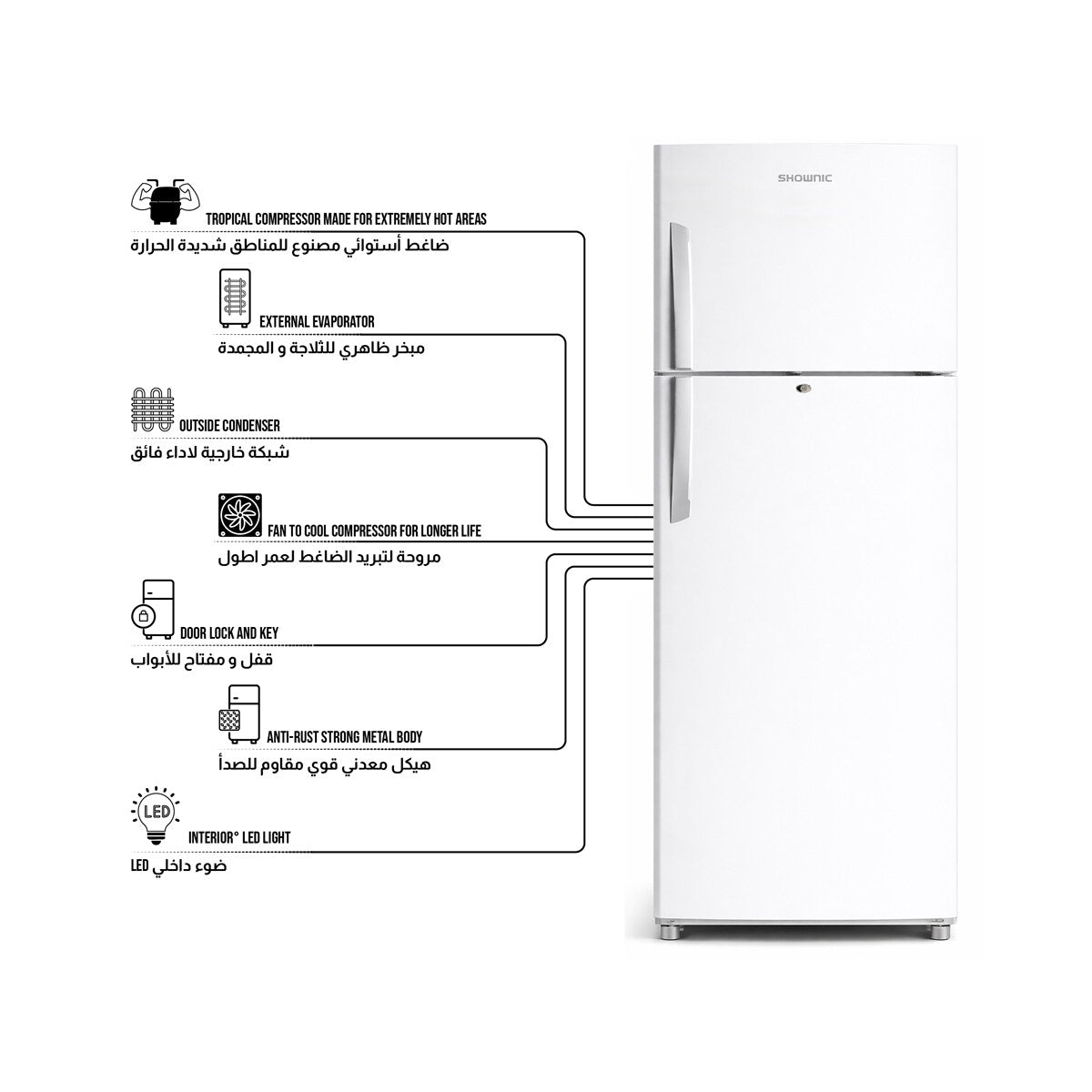 مصمم ليجمع بين المتانة والأداء العالي، يتميز ثلاجة SHOWNIC RL-540ZW بنظام تبريد مباشر موثوق يحافظ على الأطعمة طازجة ومبردة بشكل متساوٍ. ومزودة بضاغط استوائي مصمم خصيصًا للعمل بكفاءة في المناخات شديدة الحرارة، مما يجعلها مثالية للبيئات القاسية.
